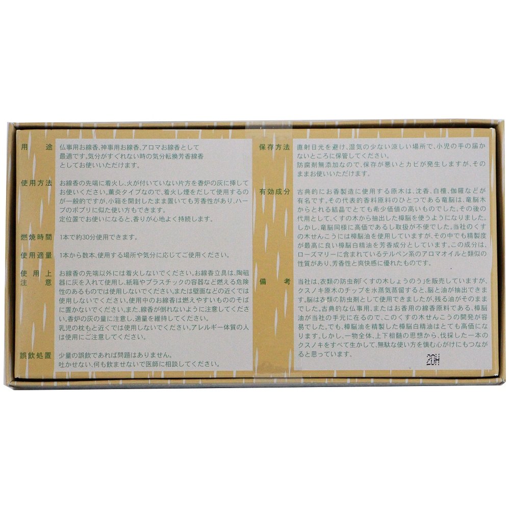 仏事用や神事用だけではなく、日常生活ではクスノキの芳香物質で、ラベンダーにも含有するシネオールに似た香りが心身に爽快感をあたえてくれますのでアロマお線香としてもお使い頂けます。