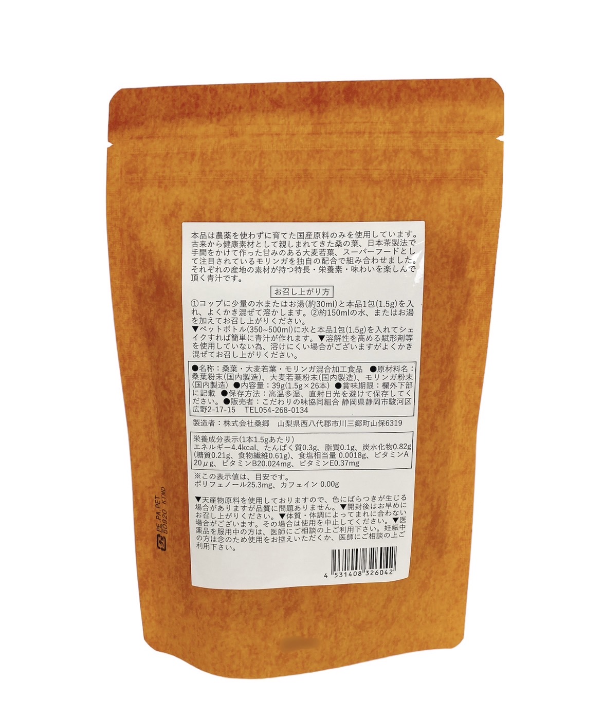| 原材料 | 桑葉粉末(国内製造)、大麦若葉粉末(国内製造)、モリンガ粉末(国際製造) |
