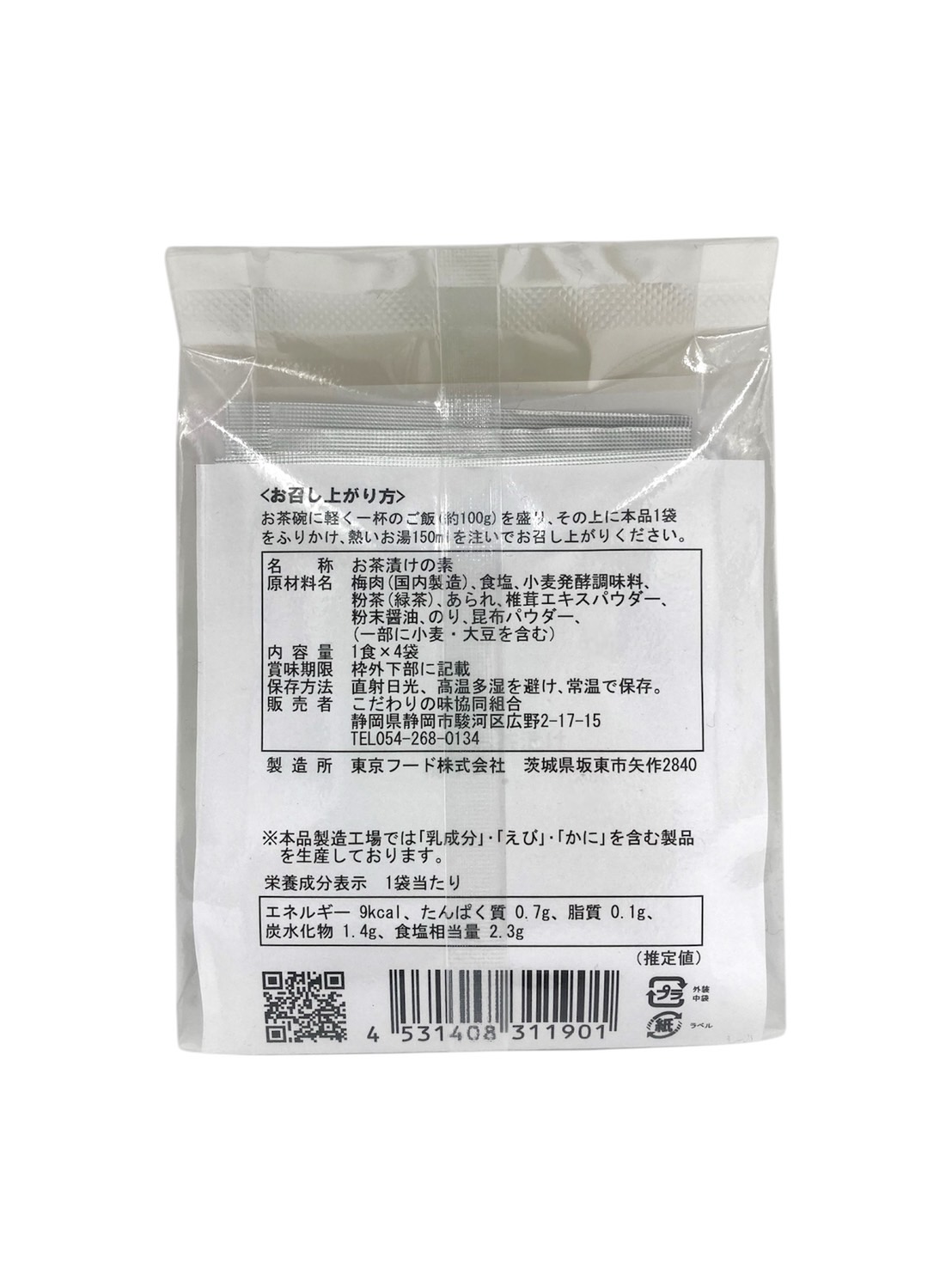 | 原材料 | 梅肉(国内製造)、食塩、小麦発酵調味料、粉茶(緑茶)、あられ、椎茸エキスパウダー、粉末醤油、のり、昆布パウダー、(一部に小麦・大豆を含む) |