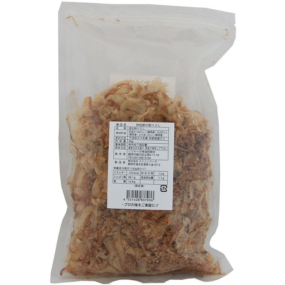 | 原材料 | 宗田かつおのふし(静岡産)、さばのふし(静岡産)、むろあじのふし(静岡産) |