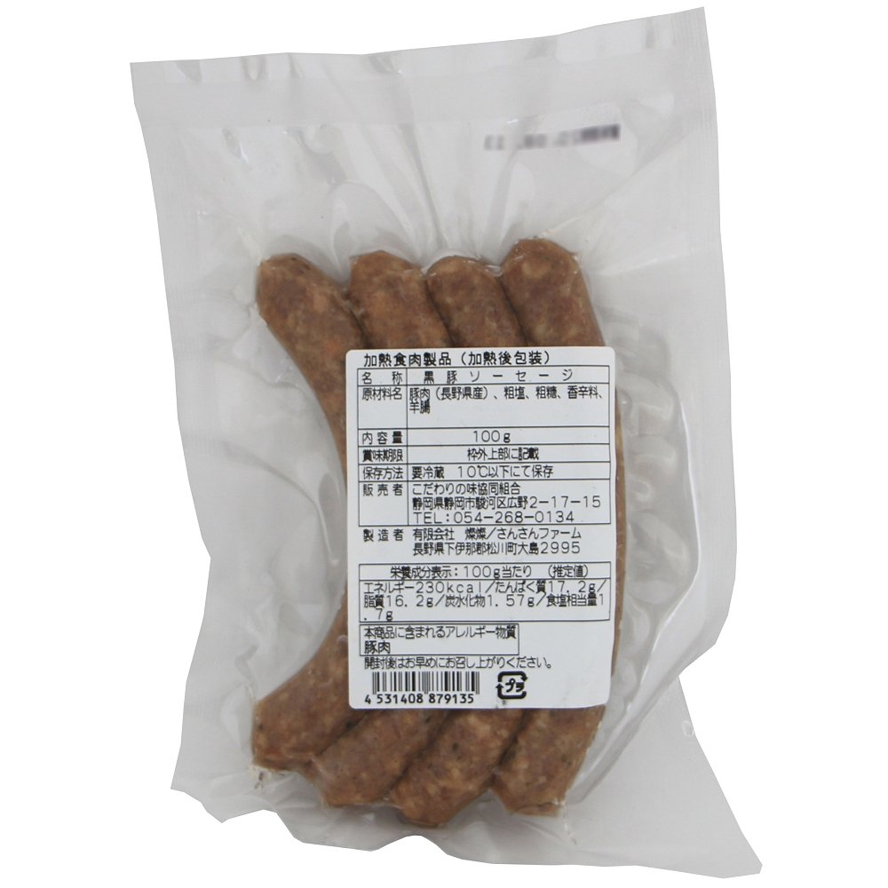 | 原材料 | 黒豚肉(さんさん黒豚)、粗塩(モンゴル岩塩)、粗糖(洗双糖)、香辛料、天然羊腸 |