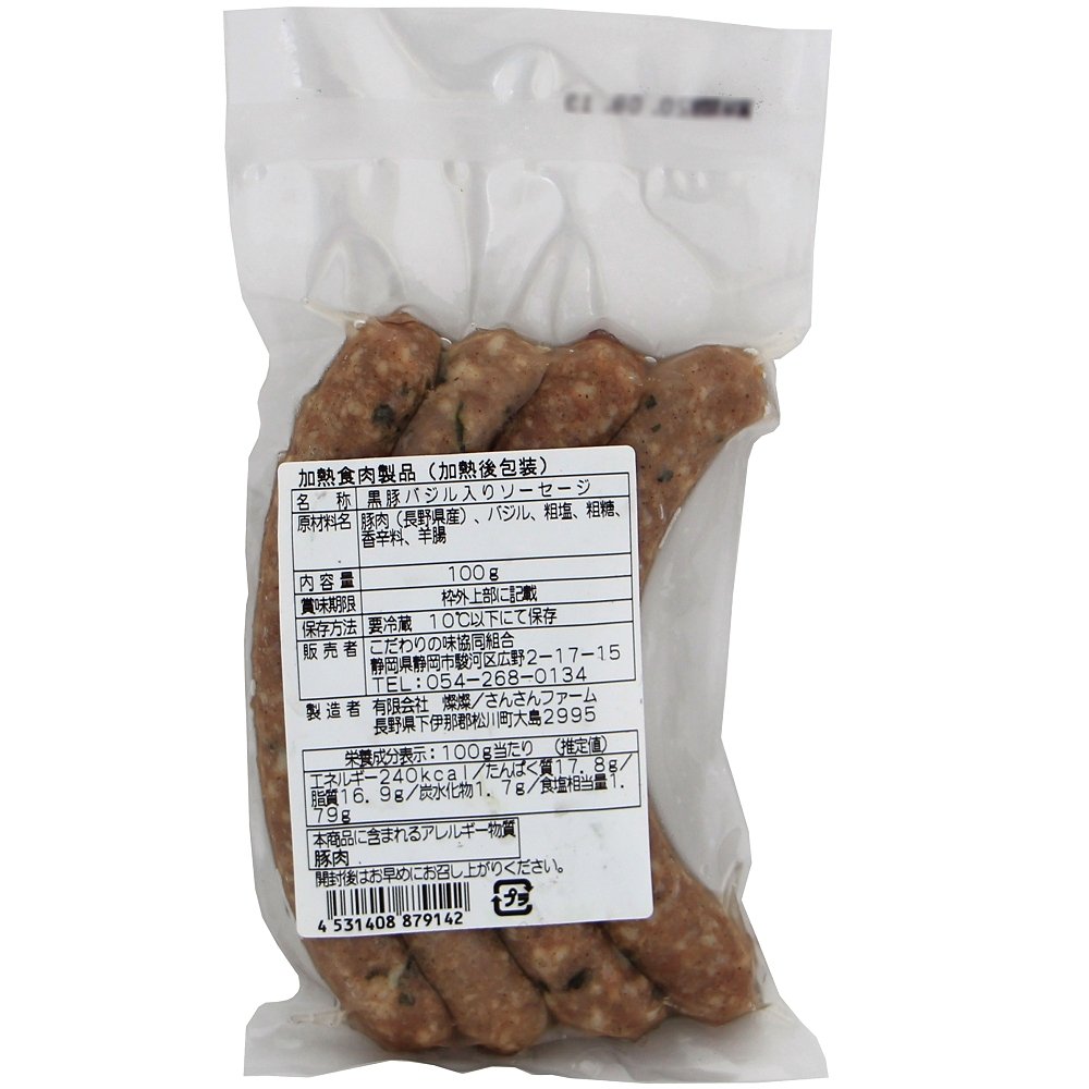 | 原材料 | 黒豚肉(さんさん黒豚)、粗塩(モンゴル岩塩)、粗糖(洗双糖)、香辛料、バジル(国産)、天然羊腸 |
