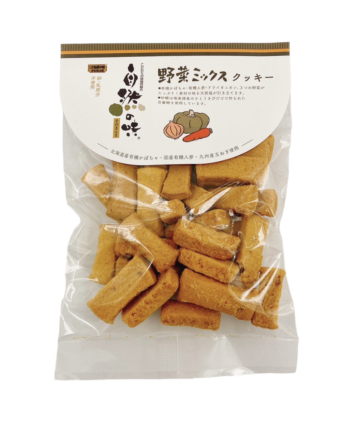 | 原材料 | 小麦粉(小麦(北海道))、有機パーム油、、有機かぼちゃ(北海道)、砂糖(含蜜糖)、有機人参(国産)、食塩(沖縄)、乾燥たまねぎ(玉ねぎ(九州)) |