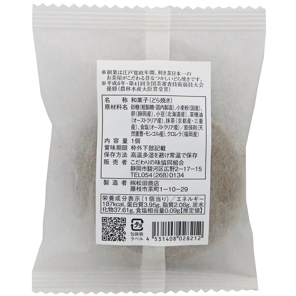 | 原材料 | 砂糖(粗製糖)、小麦粉(国産)、卵(静岡県産)、小豆(北海道産)、菜種油(オーストラリア産)、抹茶(京都産・三重産)、食塩(オーストラリア産)/膨張剤(天然重曹・モンゴル産)、クロレラ(福岡産) |