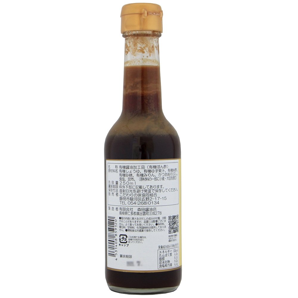| 原材料 | 有機しょうゆ(有機大豆(国産)、有機小麦、食塩)、有機ゆず果汁、有機米酢、有機砂糖、有機みりん、かつお削り節、食塩、昆布、(原材料の一部に小麦・大豆を含む) |