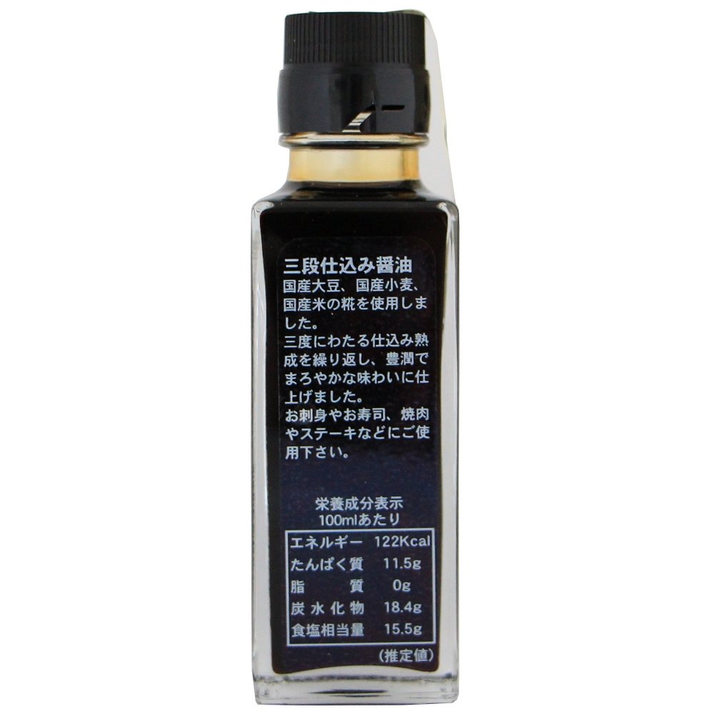 国産大豆、小麦を100%使用し、伝統的製法で育て上げた天然醸造再仕込醤油を更に「米麹」(兵庫県産米)を加え、熟成させた三段仕込醤油です。寿司や刺身に最適です。