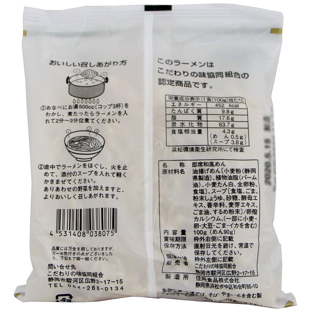 | 原材料 | 油揚げめん[小麦粉(静岡県製造)、植物油脂(パーム油)、小麦たん白、全卵粉、食塩]、スープ[食塩、ごま、粉末しょうゆ、砂糖、酵母エキス、香辛料、麦芽エキス、ごま油、するめ粉末]/卵殻カルシウム、(一部に小麦・卵・大豆・ごま・イカを含む) |