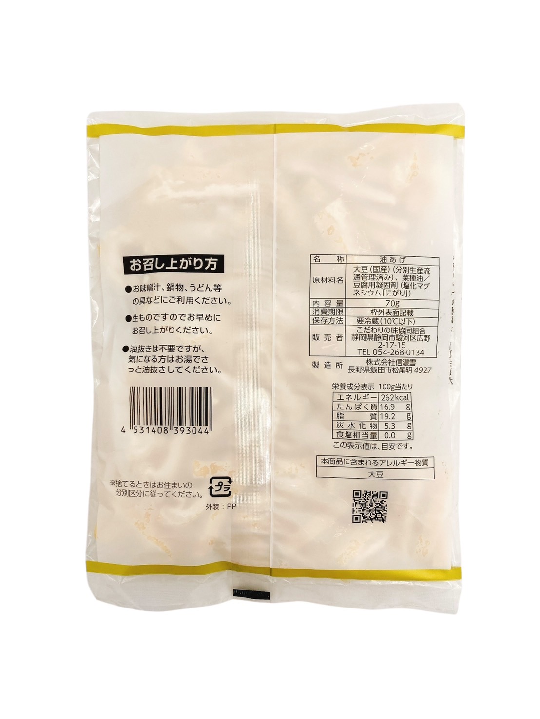豆腐質がしっかりと残った厚みがあり、食べ応えのある油揚げを使いやすい様にカットしました。お味噌汁、鍋物、うどん等の具などにご利用ください。