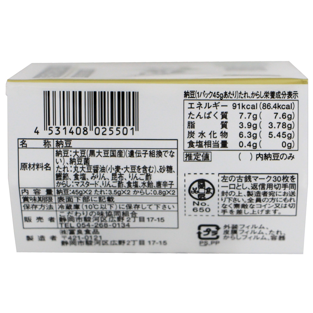 | 栄養成分表示(納豆(1パック45g当たり)、たれ、からし) | ||
