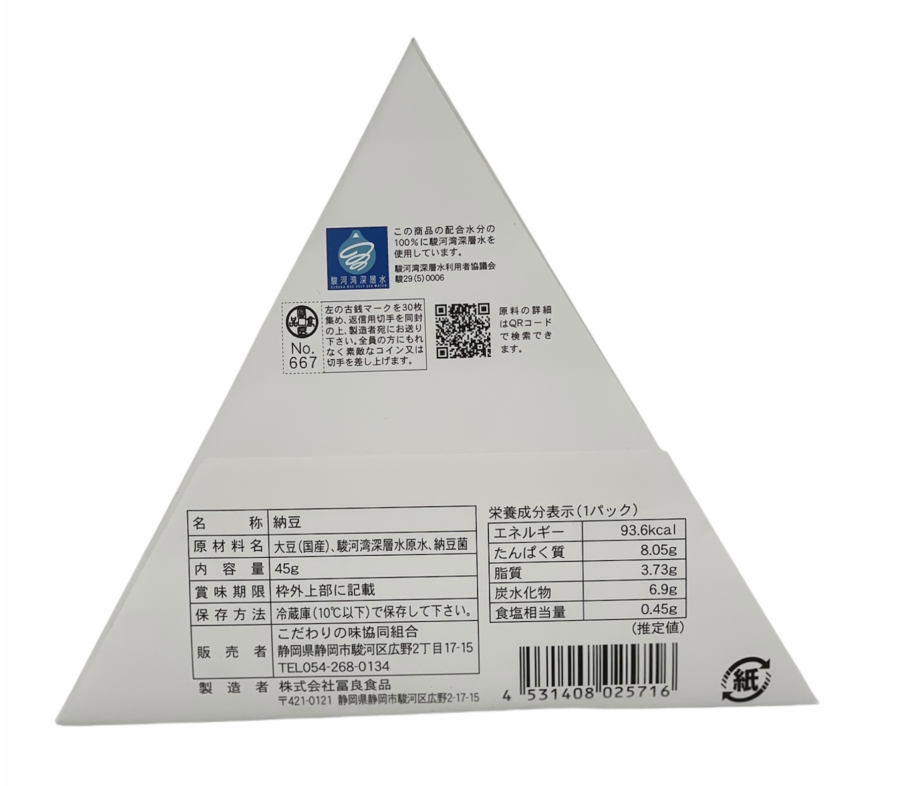 | 原材料 | 大豆(特別栽培 北海道産鈴丸大豆)、納豆菌、駿河湾産深層水 |