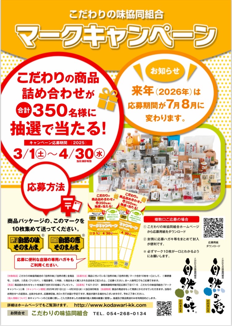 期間中、自然の味・自然の恵商品取扱の全国の販売店にて専用の応募はがきを配布しています。