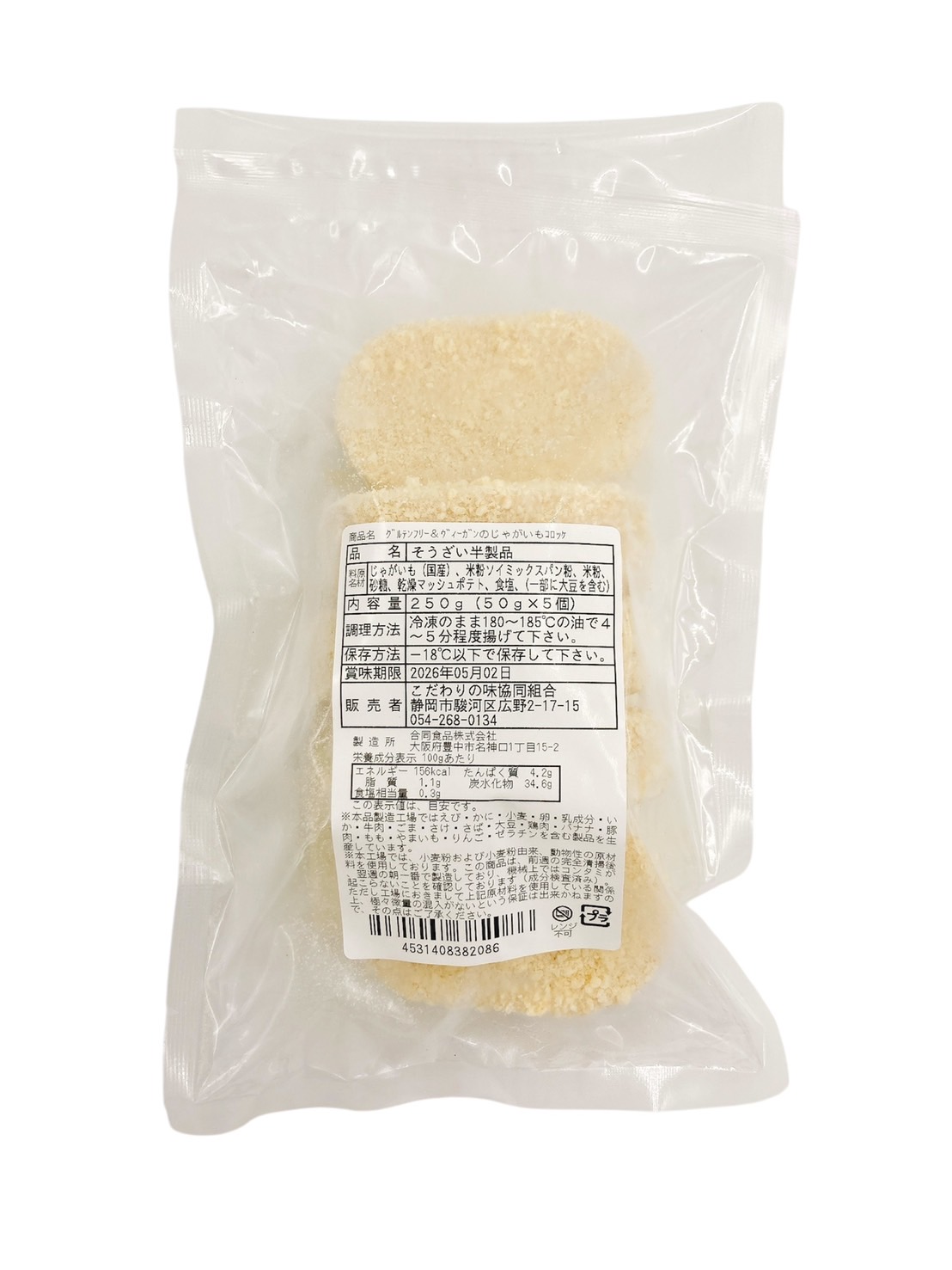 | 原材料 | じゃがいも(国産)、米粉ソイミックスパン粉、米粉、砂糖、乾燥マッシュポテト、食塩、(一部に大豆を含む) |