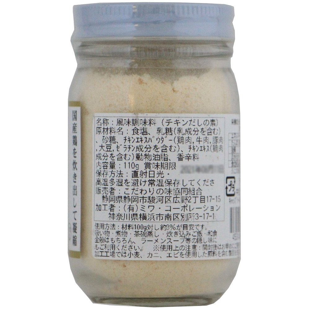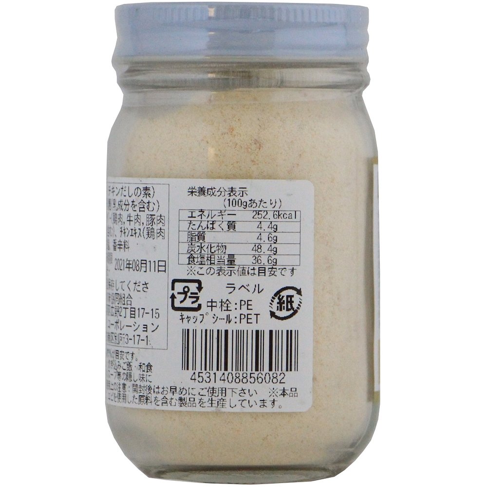 | 原材料 | 食塩、乳糖(乳成分を含む)、砂糖、チキンエキスパウダー(鶏肉、牛肉、豚肉、大豆、ゼラチン成分を含む)、チキンエキス(鶏肉成分を含む)、動物油脂、香辛料 |