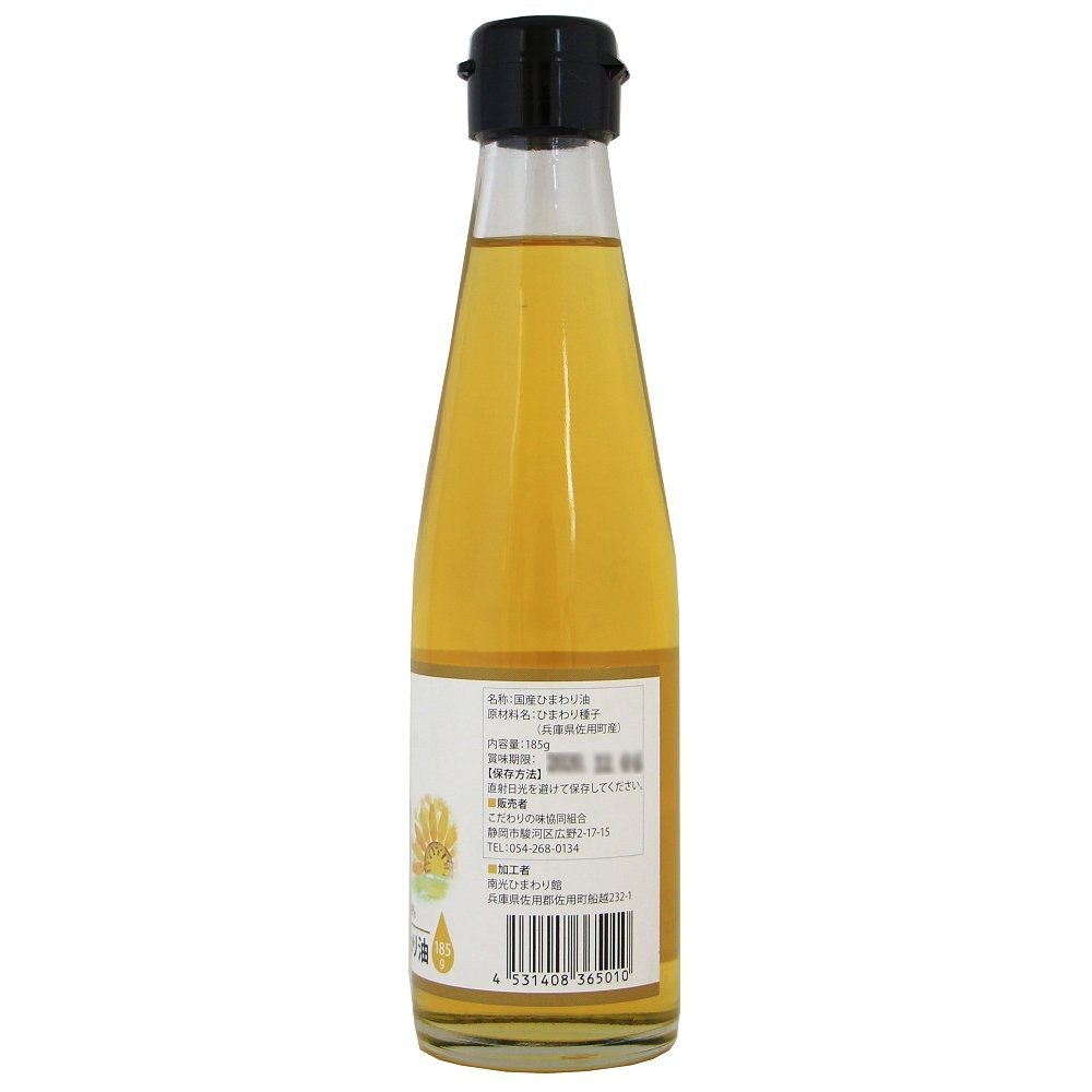 兵庫県佐用町産の無農薬で栽培したひまわりの種子を圧搾製法で搾油しました。脱臭、脱色、脱酸等の処理は行っておりません。