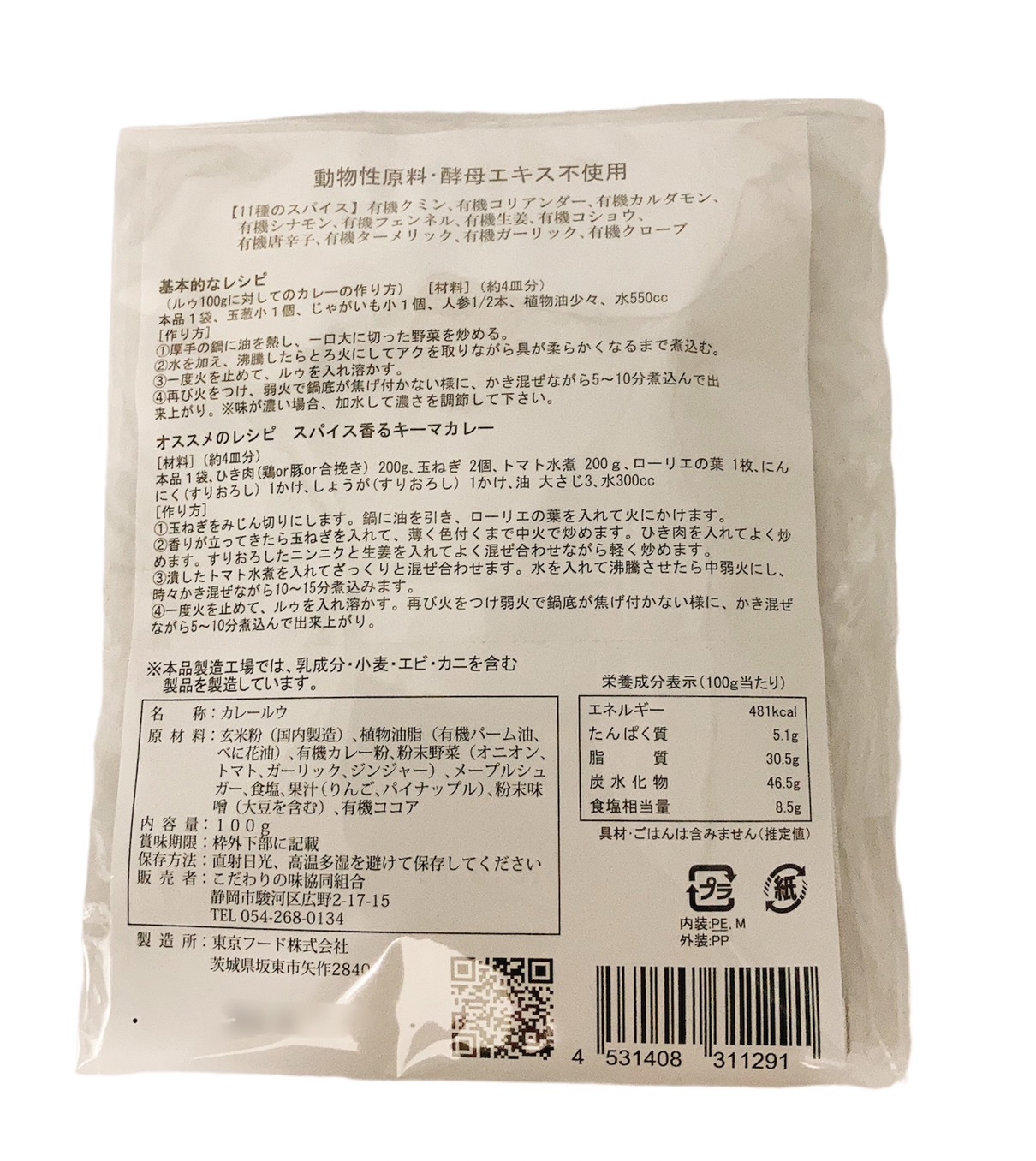 | 原材料 | 玄米粉(国内製造)、植物油脂(有機パーム油、べに花油)、有機カレー粉(有機クミン、有機コリアンダー、有機カルダモン、有機シナモン、有機ファンネル、有機生姜、有機コショウ、有機唐辛子、有機ターメリック、有機ガーリック、有機クローブ)、粉末野菜(オニオン、トマト、ガーリック、ジンジャー)、メープルシュガー、食塩(天日塩)、果汁(りんご、パイナップル)、粉末味噌、有機ココア(原材料の一部に大豆を含む) |