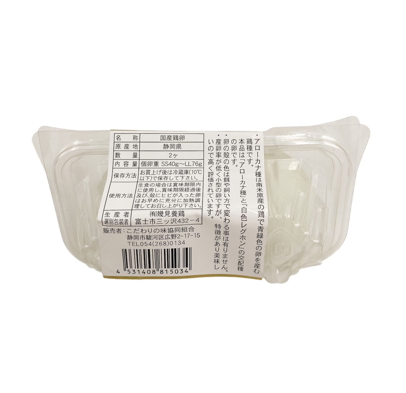 富士山の雪解け水と、PHF、NON-GMO原料によって配合された飼料を与えて育った鶏から生まれた卵です。殻が青いのは栄養が豊富な証拠。黄身の濃厚な味わいとコクが魅力です。アロウカナ(雄)と白色レグホン(メス)を交配させた、純国産鶏「岡崎アロウカナ」から生まれた卵です。