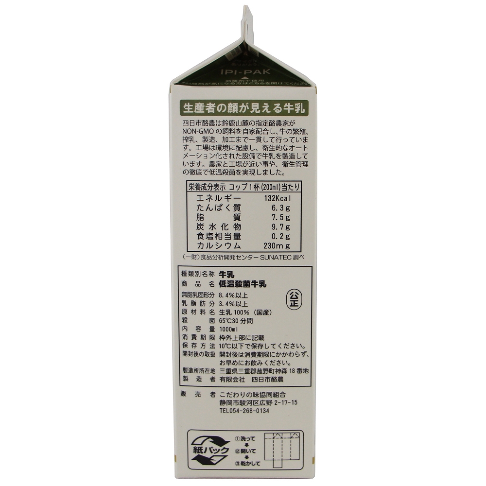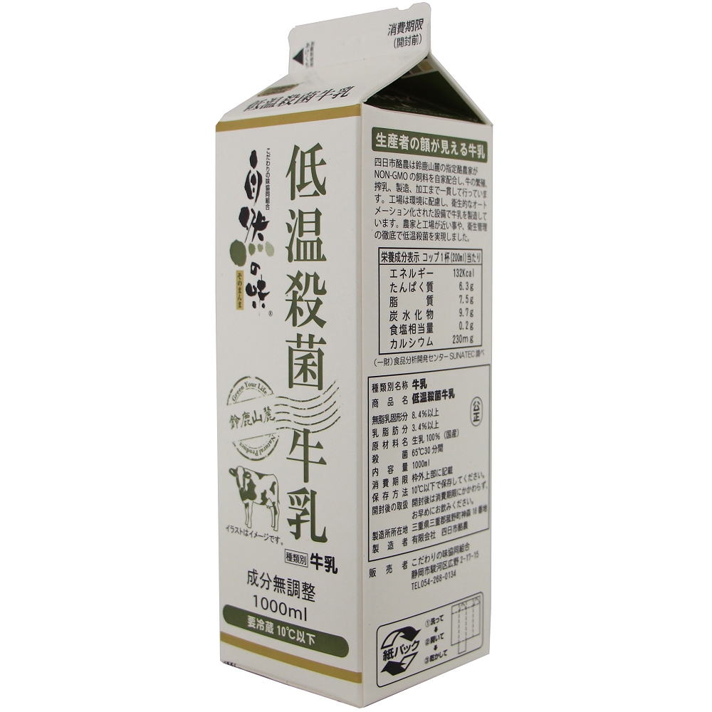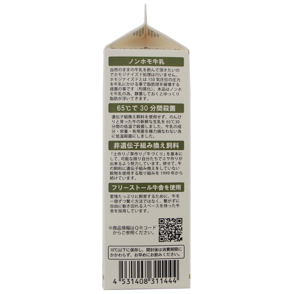 遺伝子組換え分別生産流通管理済みの飼料で、のんびりと育った牛の新鮮な生乳を65℃30 分間の低温で殺菌しました。牛乳の成分・栄養素を極力熱変成させない為に低温殺菌しました。ホモジナイズド処理を行わないノンホモ牛乳の為、牛乳の状態がより搾りたてに近づき、より自然の状態に近い風味が楽しめます。