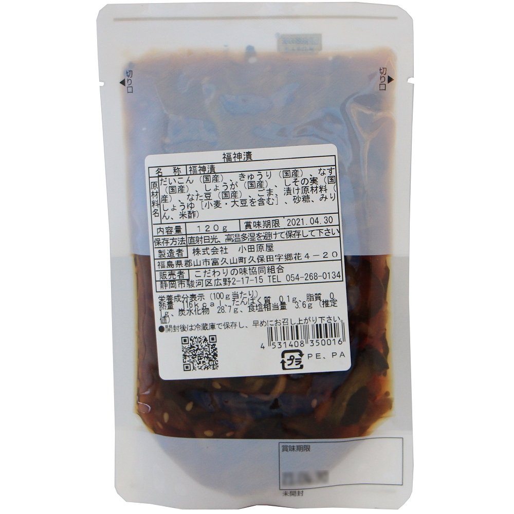 | 原材料 | 大根(国産)、胡瓜(国産)、茄子(国産)、生姜(国産)、しその実(国産)、なた豆(国産)、ごま、漬け原材料(醤油、砂糖、みりん、米酢) |